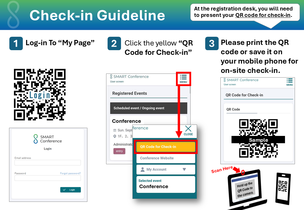 Please present your Check-in QR code at the registration desk, which can be found in the registration system. Once scanned, your name badge will be printed automatically. Badges must be worn at all times within the conference venue, including all receptions.